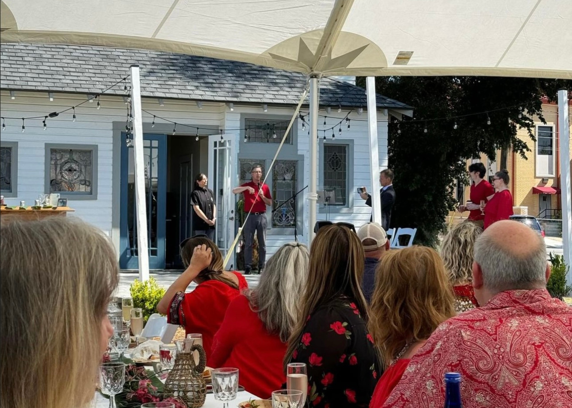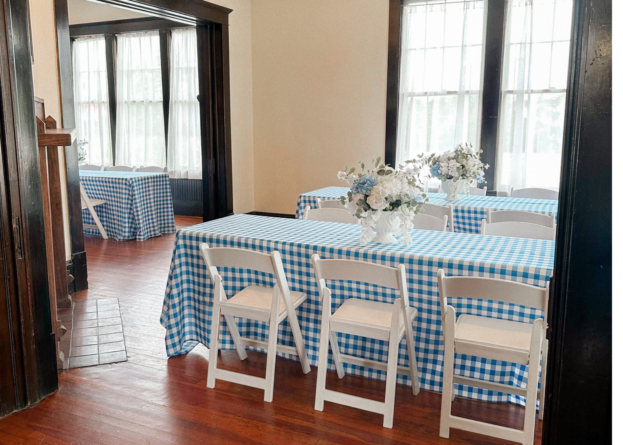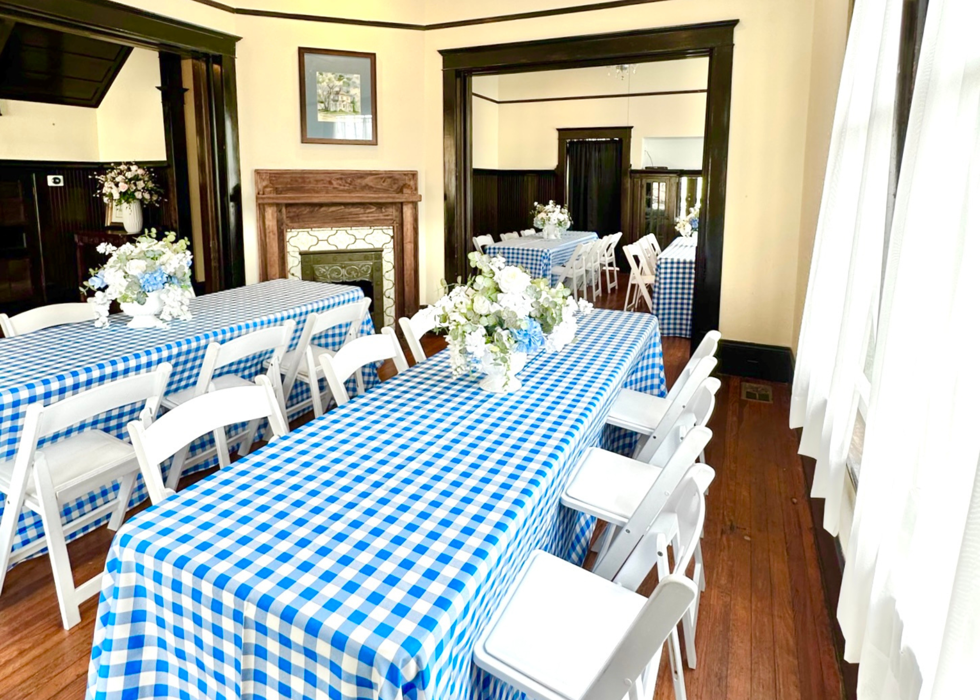 -Two main gathering rooms that connect downstairs, for up to 50 guests (seated) or 85 (standing) with direct access to the front porch through french doors